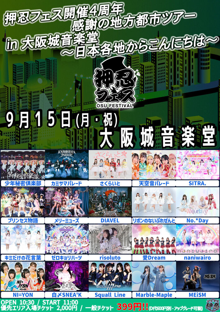 ライブ(大阪) Schedule 2025/09/15(月) 00:00 - 大阪城音楽堂 地図を表示 「押忍フェス開催4周年 感謝の地方都市ツアー in 大阪城音楽堂〜日本各地からこんにちは〜」 大阪城音楽堂 OPEN 10:30 / START 11:00 前方優先エリア 2,000円 (当日券 +500円) 一般エリア 399円 (当日券 +601円) ・ドリンク代600円別途要 ・アップグレード可能チケット販売8月2日(土)10:00~ チケットページ URLをコピーする 報告する