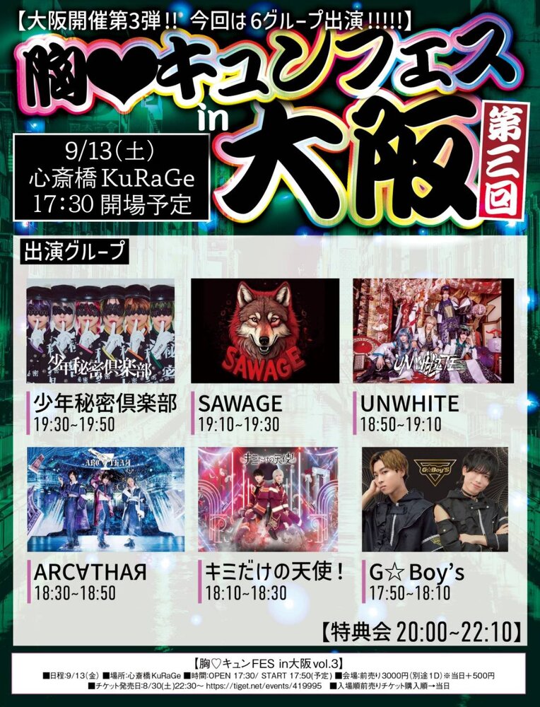 ライブ(大阪) Schedule 2025/09/13(土) 18:00 - 心斎橋KuRaGe 屋上ステージ 『胸♡キュンFES in大阪 vol.3 』 ■日程:2025.09.13(土) ■場所:大阪KuRaGe ■時間 OPEN17:30/17:50 ■会場:前売り¥3000(別途1D)当日+¥500 チケット発売:8/30 22:30~ チケットページ URLをコピーする 報告する