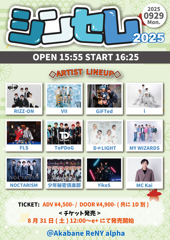ライブ(赤羽) Schedule 2025/09/29(月) 00:00 - 赤羽ReNY alpha <日時>9/29(月) <時間>OPEN15:55 START16:25 <場所>赤羽ReNY <料金>前売り4,500円+1D(600円) 当日券4,900円+1D 🎤19:55~20:15/📷20:40~22:00 <前売りチケット> 8月31日(土)12:00〜e+にて発売開始 チケットページ URLをコピーする 報告する