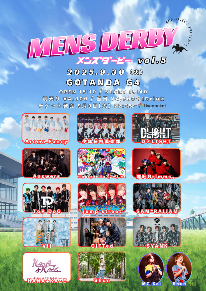 ライブ(五反田) Schedule 2025/09/30(火) 00:00 - GOTANDA G4 『MENS DERBY vol.5』 📍GOTANDA G4 ⏰OPEN 15:10/START 15:40 🎫前売り4,000円+1D(600円)/当日券4,300円+1D ✍️チケット販売 9月9日(火)22:25〜 チケットページ URLをコピーする 報告する