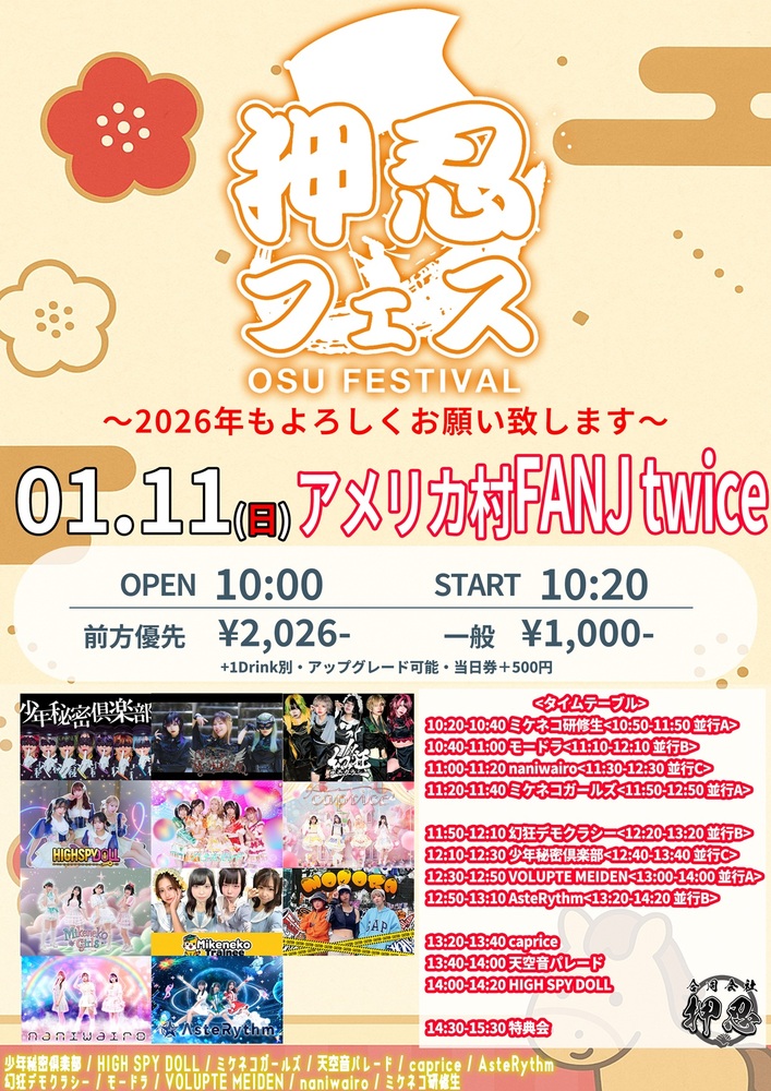 ライブ(大阪) Schedule 2026/01/11(日) 10:00 - アメリカ村FANJ twice 地図を表示 「押忍フェス〜2026年もよろしくお願い致します〜」🗓️1月11日(日)📍アメリカ村FANJ twice⏰OPEN 10:00 / START 10:20🎫優先 2,026円 / 一般 1,000円(1ドリンク代別・アップグレード可能・当日券+500円)✍️12月13日(土)22:00 チケットページ URLをコピーする 報告する