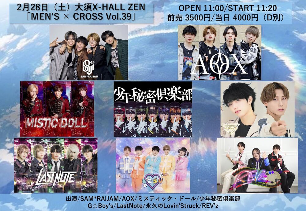 ライブ(名古屋) Schedule 2026/02/28(土) 11:00 - X-HALL ZEN 2月28日(土)「MEN’S × CROSS Vol.39」大須X-HALL ZENOPEN 11:00/START 11:20前売 3500円/当日 4000円(D別)🎤13:05~13:25/📷14:30~15:45チケットフォーム(1/30 22:50発売) チケットページ URLをコピーする 報告する