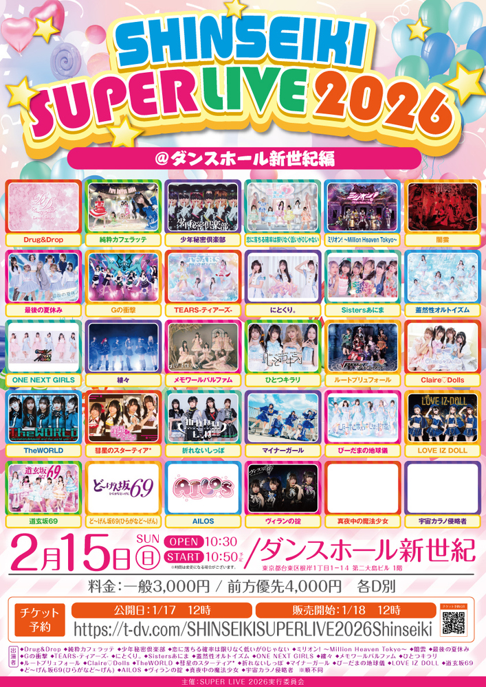 ライブ(鶯谷) Schedule 2026/02/15(日) 17:00 - ダンスホール新世紀 『SHINSEIKI SUPER LIVE 2026@ダンスホール新世紀編』🗓️2月15日(日)📍ダンスホール新世紀⏰OPEN 10:30 / START 10:50(予定)🎫一般 3,000円/ 前方優先 4,000円(各D別)✍️1月18日(日)12:00~ チケットページ URLをコピーする 報告する