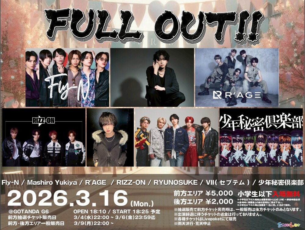 ライブ(五反田) Schedule 2026/03/16(月) GOTANDA G6 3/16『FULL OUT!!』📍五反田G6🕰️OP/ST 18:10/18:25 予定前方チケット抽選受付は3/4(水)22時から チケットページ URLをコピーする 報告する